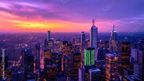 Obraz premium A vibrant city skyline at sunset with colorful clouds and lights.