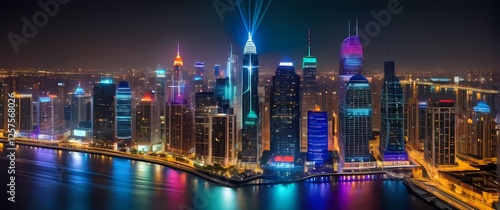 Fototapeta premium A vibrant city skyline glittering at night with high rise buildings adorned with colorful lights encapsulating the heartbeat of luxury urban living