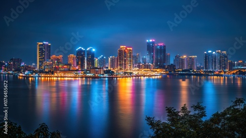 © Solikah, Obraz premium A vibrant city skyline illuminated at night, reflecting on the water.