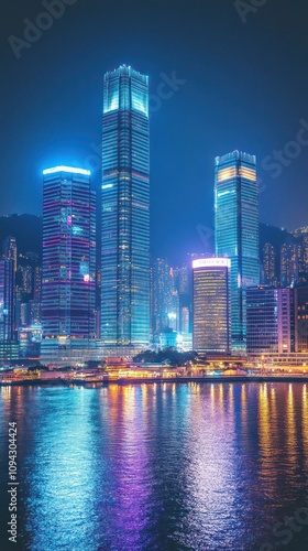 © Trionorejo, Fototapeta premium A vibrant city skyline illuminated at night, reflecting on water.