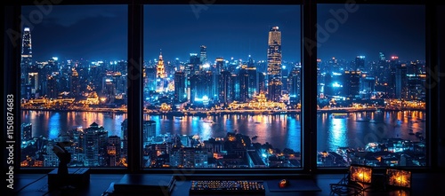 © M_H_L, Obraz premium A vibrant city skyline illuminated at night with reflections on the water.