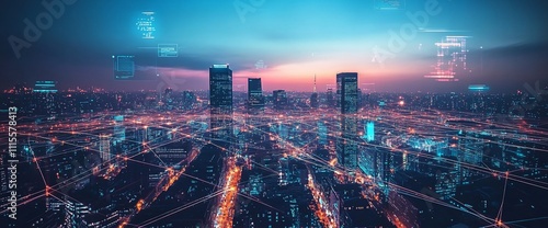 Fototapeta premium A vibrant city skyline illuminated by digital data overlays at dusk.