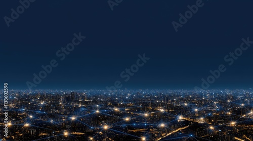 © lililia, Obraz premium A vibrant city skyline illuminated by holographic lights against a blue night sky highlights advanced technology in urban settings
