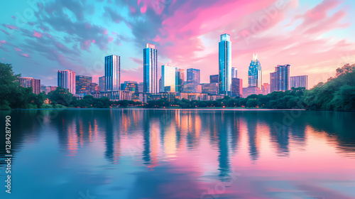 © Thiago, Fototapeta premium A vibrant city skyline reflected in water, showcasing contrasting blue and pink hues. Ethereal City Skyline. Illustration