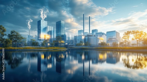 Naklejka premium A vibrant city skyline reflects on a serene lake, showcasing modern...