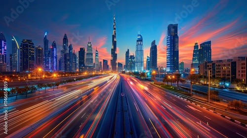 © M_H_L, Fototapeta premium A vibrant cityscape at dusk featuring skyscrapers and illuminated traffic.