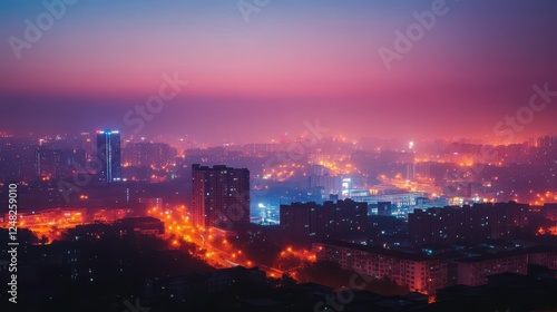 Obraz premium A vibrant cityscape at dusk, illuminated by glowing lights beneath a misty sky, creating a serene yet dynamic urban atmosphere.
