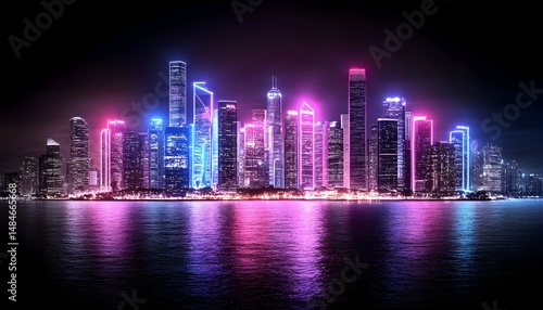 Fototapeta premium A vibrant cityscape at night, illuminated by neon lights reflecting in the water