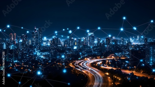Fototapeta premium A vibrant cityscape at night showcasing interconnected lights and dynamic traffic, symbolizing urban connectivity and technology.
