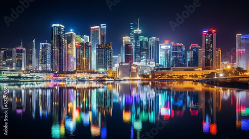 Fototapeta premium A vibrant cityscape at night, with buildings illuminated and reflecting on the water, showcasing the allure of urban nightlife tourism Generative AI