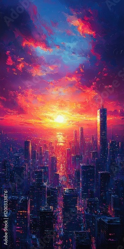 © Arek, Fototapeta premium A vibrant cityscape at sunset painted with thick impasto strokes. Perfect for backgrounds, posters, or book covers.