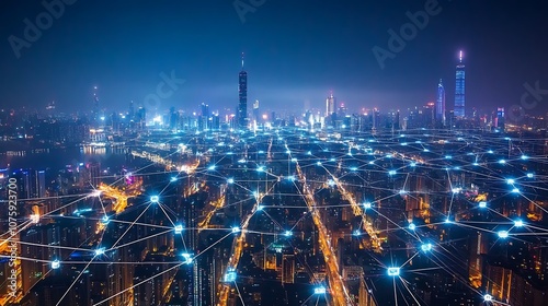 Obraz premium A vibrant cityscape illuminated at night, showcasing a network of connections symbolizing technology and communication.