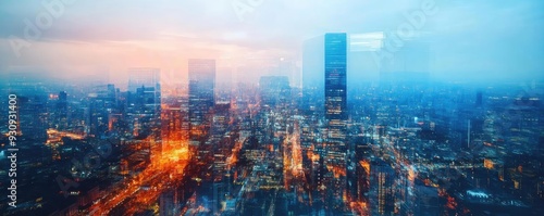 Fototapeta premium A vibrant cityscape illuminated by twilight, showcasing towering buildings...