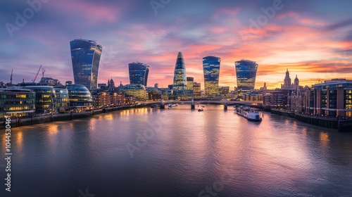 Obraz premium A vibrant cityscape of London at sunset, showcasing modern skyscrapers along...