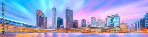 © SJarkCube, Naklejka premium A vibrant cityscape of New York at dusk, showcasing the iconic landmark with high-rise buildings . The sky is painted with hues of blue and purple as the sun sets behind them, casting long shadows on