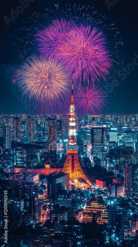 © Eman Suardi, Obraz premium A vibrant cityscape of Tokyo with fireworks illuminating the skyline.