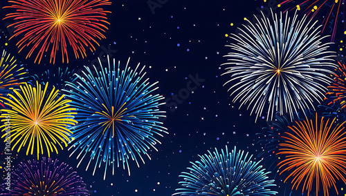 Naklejka premium a vibrant cityscape photograph featuring a nighttime skyline with a series of large, colorful fireworks exploding in the sky. The fireworks display a range of colors,