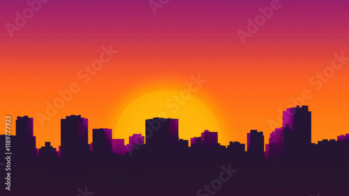 Naklejka premium A vibrant cityscape silhouette at sunset, with bold orange and purple tones...
