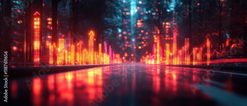 © Solikah, Fototapeta premium A vibrant cityscape with glowing data visualizations on a reflective road.