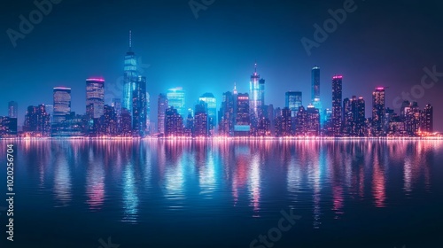 Fototapeta premium A vibrant cityscape with skyscrapers illuminated at night, reflecting on the water.