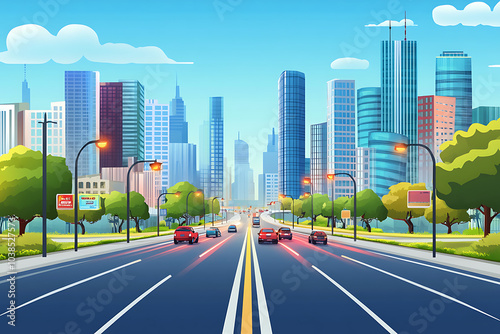 Fototapeta premium A vibrant cityscape with skyscrapers, trees, and busy streets under a bright...