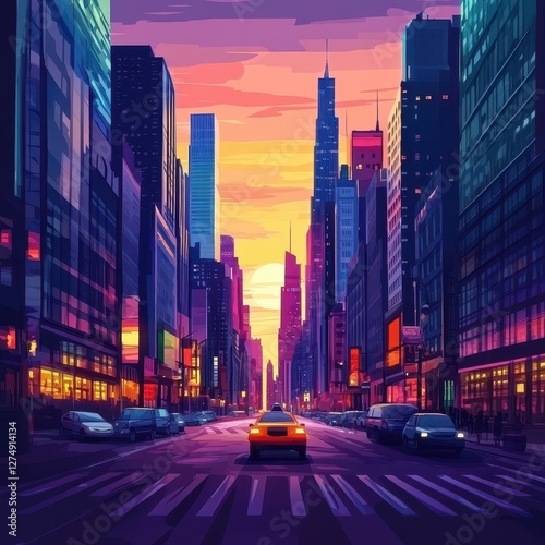 © novian, Obraz premium A vibrant cityscape with tall buildings and a sunset