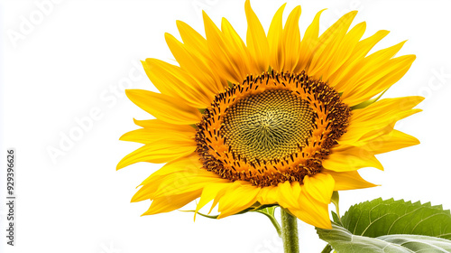 Fototapeta premium A vibrant, close-up photograph of a fully bloomed yellow sunflower with intricate details of its seeds and petals against a white background.