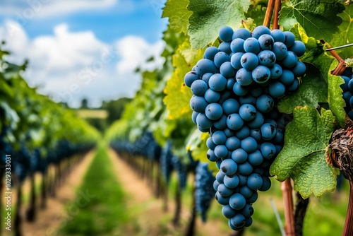 © Peeradontax, Fototapeta premium A vibrant close-up shot of a ripe cluster of deep purple grapes hanging from a vine in a vineyard.