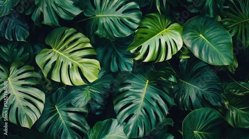 Fototapeta premium A vibrant close-up shot of a tropical green leaf, a flat lay backdrop,...