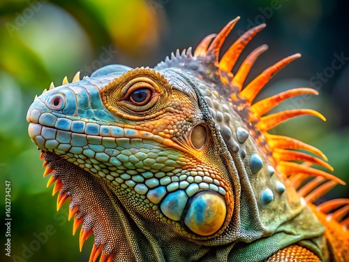 © BONNA AKTHER AME, Fototapeta premium A vibrant closeup of an iguanas face, showcasing its colorful scales and intricate details in nature