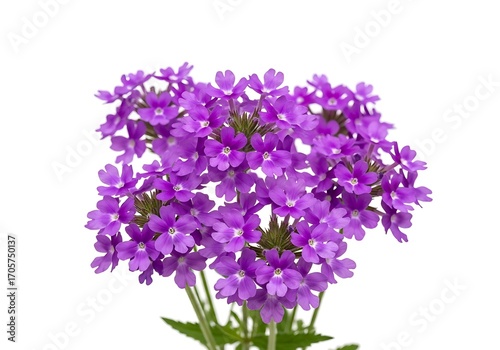 © Sahnaj, Naklejka premium A vibrant cluster of small purple verbena flowers isolated on white background, showcasing delicate petals and green stems