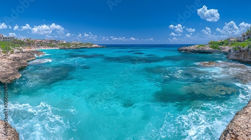 © MetaKibo, Obraz premium A vibrant coastal scene featuring clear turquoise waters and rocky shores.