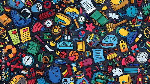 © rizkan, Obraz premium A vibrant collage of various colorful doodles representing everyday objects and activities