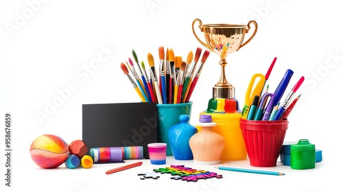Fototapeta premium A vibrant collection of art supplies and a trophy, perfect for creative...