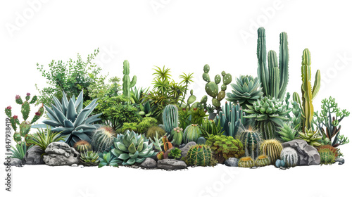 Fototapeta premium A vibrant collection of cacti and succulents in a desert landscape. The...