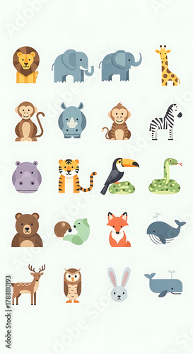 © Fhaa, Obraz premium A vibrant collection of cartoon animal illustrations, showcasing a diverse range of wildlife from various habitats on a clean white background.