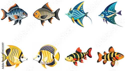 © Anamul, Fototapeta premium A vibrant collection of cartoon fish, featuring diverse shapes, colors, and fin patterns.