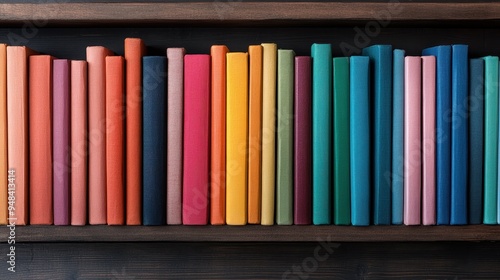 Naklejka premium A vibrant collection of colorful books lined up neatly on a dark wooden bookshelf, creating a visually appealing and cheerful display of literature and order.