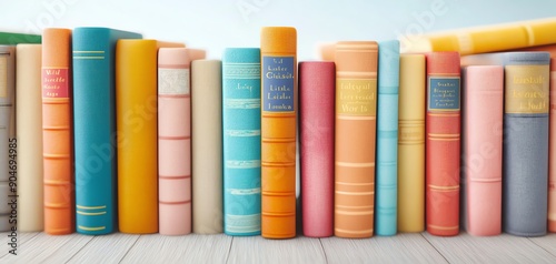 Naklejka premium A vibrant collection of colorful books lined up on a shelf, perfect for showcasing creativity and knowledge.