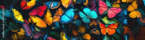 © Rere_Art151, Naklejka premium A vibrant collection of colorful butterflies with their wings spread wide on a bed of green leaves