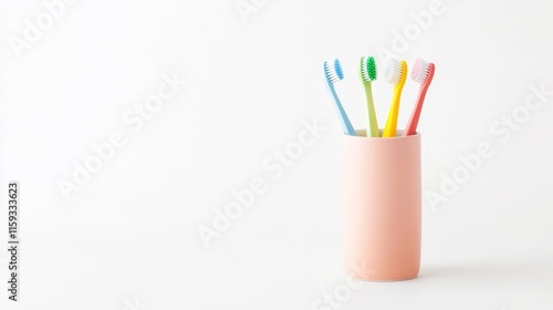© อาริษา วันดี, Fototapeta premium A Vibrant Collection of Colorful Toothbrushes in a Modern Pink Holder on a Clean, Minimalist Background for Inspirational Dental Care Imagery