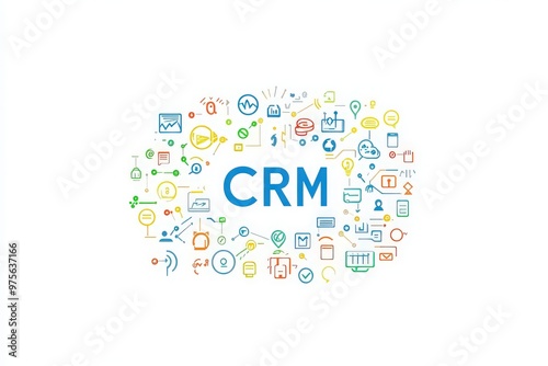 Fototapeta premium A vibrant collection of digital network icons encircles the letters CRM, illustrating modern concepts in customer relationship management and emphasizing connectivity and data flow.