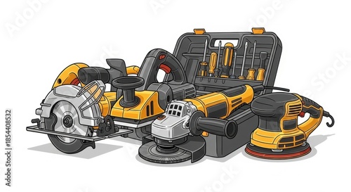 Fototapeta premium A vibrant collection of power tools showcases craftsmanship and readiness for...