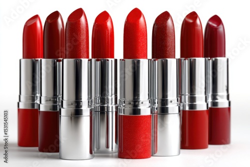 Obraz premium A vibrant collection of red lipsticks in sleek silver tubes, standing...