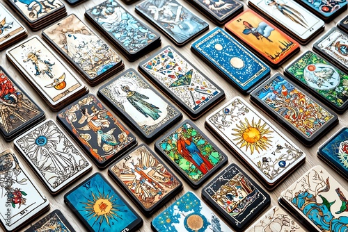 © ArtisticSnap, Obraz premium A vibrant collection of tarot cards showcasing intricate designs and symbols that inspire mystery and intuition.