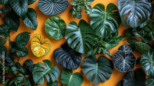 © PuriStudio, Naklejka premium A Vibrant Collection of Tropical Green Leaves on a Bright Orange Background Perfect for Nature Lovers and Interior Decor Inspiration