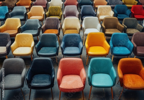 Fototapeta premium A Vibrant Collection of Upholstered Chairs in Diverse Colors and Styles Arranged in a Captivating Pattern for Interior Design Inspiration and Home Decor Aesthetics
