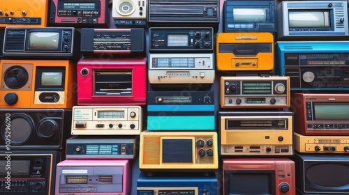 Fototapeta premium A vibrant collection of vintage radios in various colors and designs,...