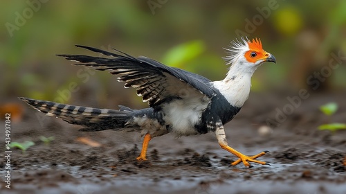 © isend, Obraz premium A vibrant, colorful bird in motion on a muddy ground.