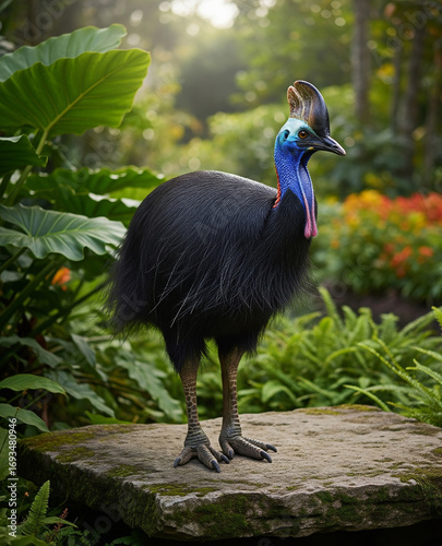 Naklejka premium A vibrant, colorful cassowary stands alert on a mossy stone platform in a lush, green tropical garden. The background is filled with a variety of foliage and flowers, and sunlight shines down on the b